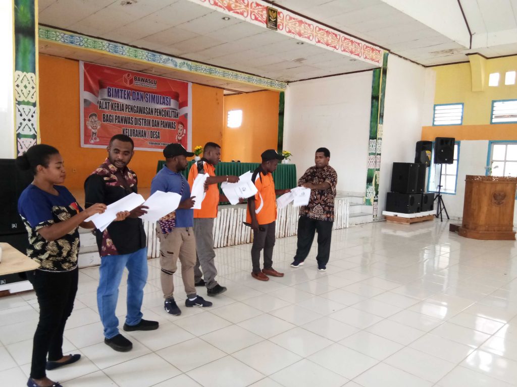Bawaslu Sorong Selatan. Meamsuki tahapan Bawaslu Sorsel lakukan Bimtek dan Simulasi Alat Kerja Pengawasan Pencoklitan Bagi Panwas Distrik dan Panwas Kelurahan/Desa